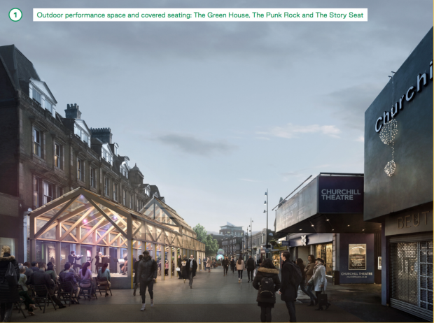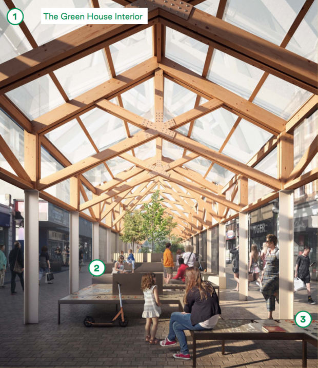 • A covered seating area inviting visitors to dwell and use the public realm in any weather and thereby support local shops and food outlets.