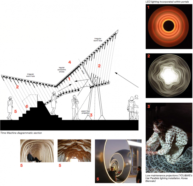 The installation is experienced at different scales. It works both as an illuminated beacon from afar, as well as being immersive at an individual scale: You can sit within the worm hole; look up through its underbelly and mirror periscope; or be flooded by the poem light projection. The installation uses bright colours, low energy lighting and floor projections to create a dynamic piece which has different qualities in the day and night. The double cone framework is made from powder coated slatted metal, with concrete steps and timber seating.