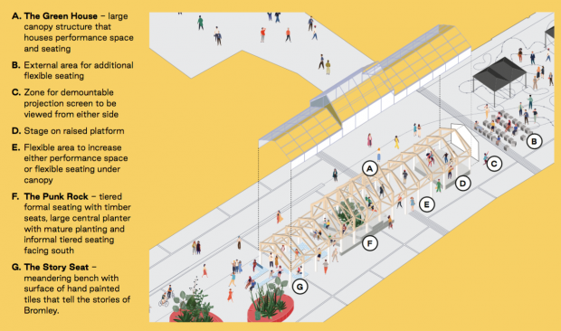 The main structure on the central site will be the Green House, a timber glazed canopy which references Charles Darwin, Crystal Palace and Bromley’s half-timbered houses. The Green House will be a lightweight, welcoming and light filled space which will glow at night with low energy lighting. Located centrally and close to Churchill Theatre and Bromley Library, the canopy, seating and performance area will form a new hub for everyday use as well as larger events on the High Street. The location benefits from close proximity to central public facilities as well as links to Church House Gardens. The new interventions will correspond with the flexible use of Churchill Square.