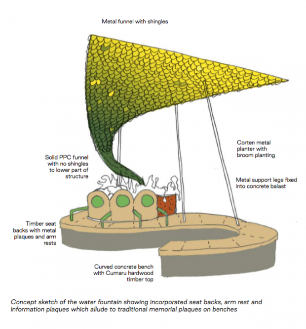 The Broom Flower is a sculptural jewel-like funnel which incorporates a drinking fountain, curved bench and planter. The form and golden colour takes cues from the Broom Flower after which the town is called - “The place where Broom grows”.