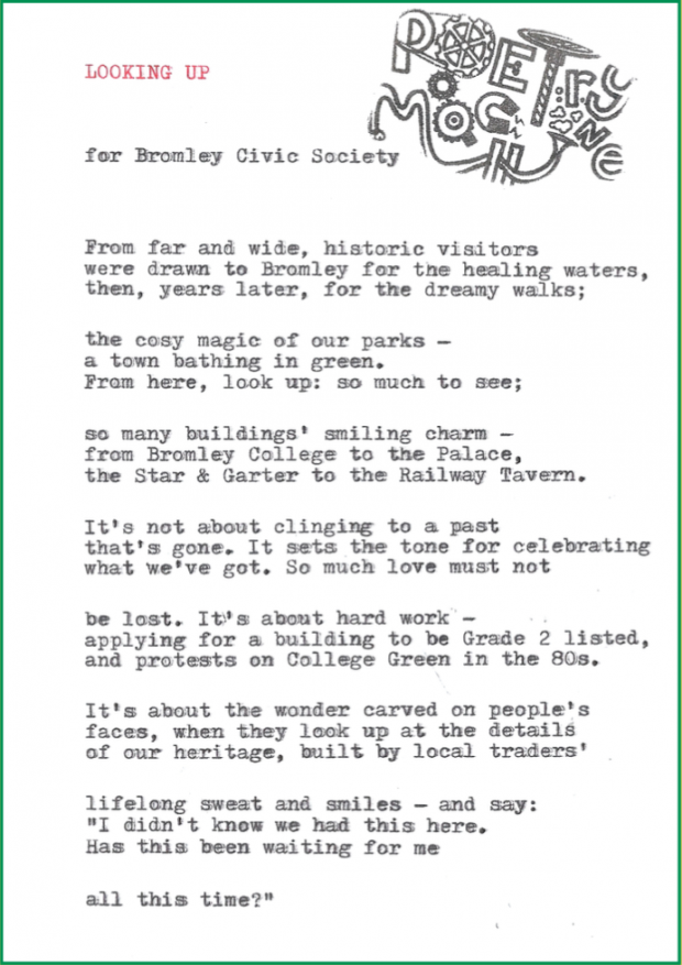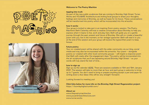 As part of our design process, we have worked with local groups to share their thoughts, feelings and memories of Bromley, as well as hopes for its future. Beth Calverley from The Poetry Machine has guided participants through these sessions remotely. Each group was given a choice about how to take part - some wrote the poems themselves, while others had a conversation with Beth, who wove their words into poetry, live in the moment, on her vintage typewriter.