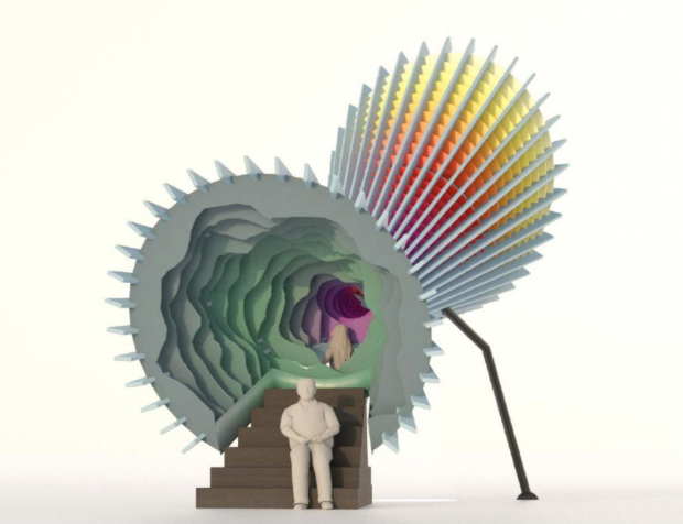 The Time Machine is an experiential sculptural installation that celebrates Bromley’s literary heritage, with specific reference to H.G. Wells’ science fiction writing. The design plays on abstracted time travel theories of time machines, time tunnels, worm holes and portals. It plays with false perspective, cosmic circular forms and illusion.