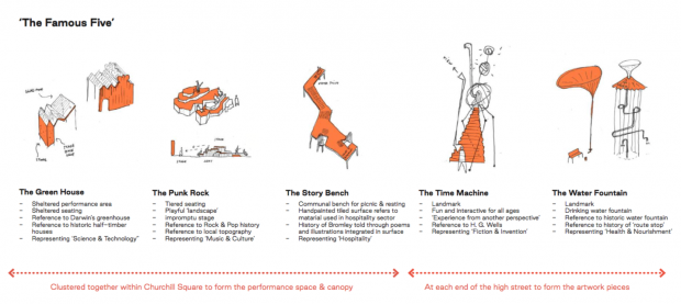We have responded to the project brief with five interventions. These ‘Famous Five’ pieces draw inspiration from different elements of Bromley’s past and present. Collectively they tell Bromley’s story.