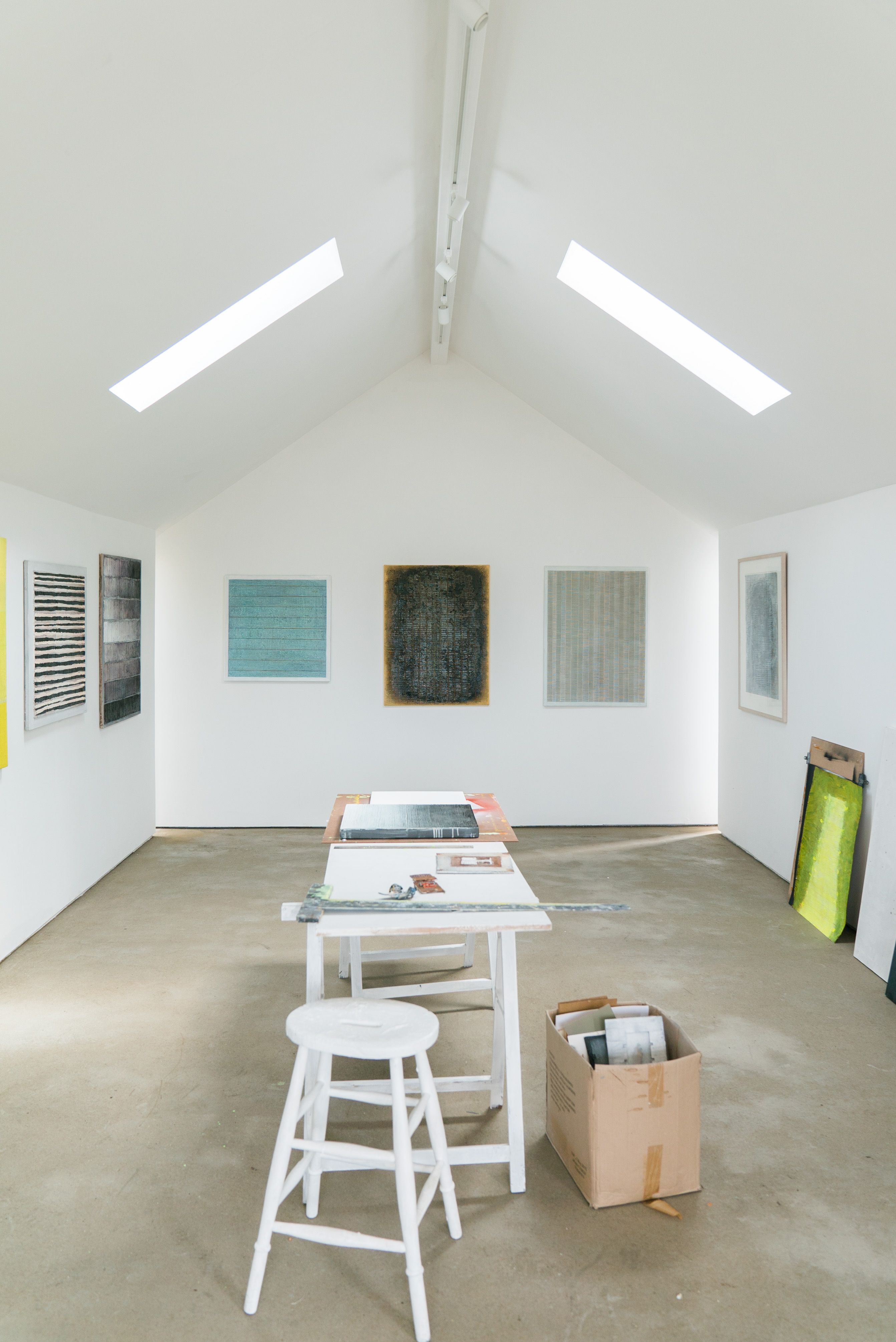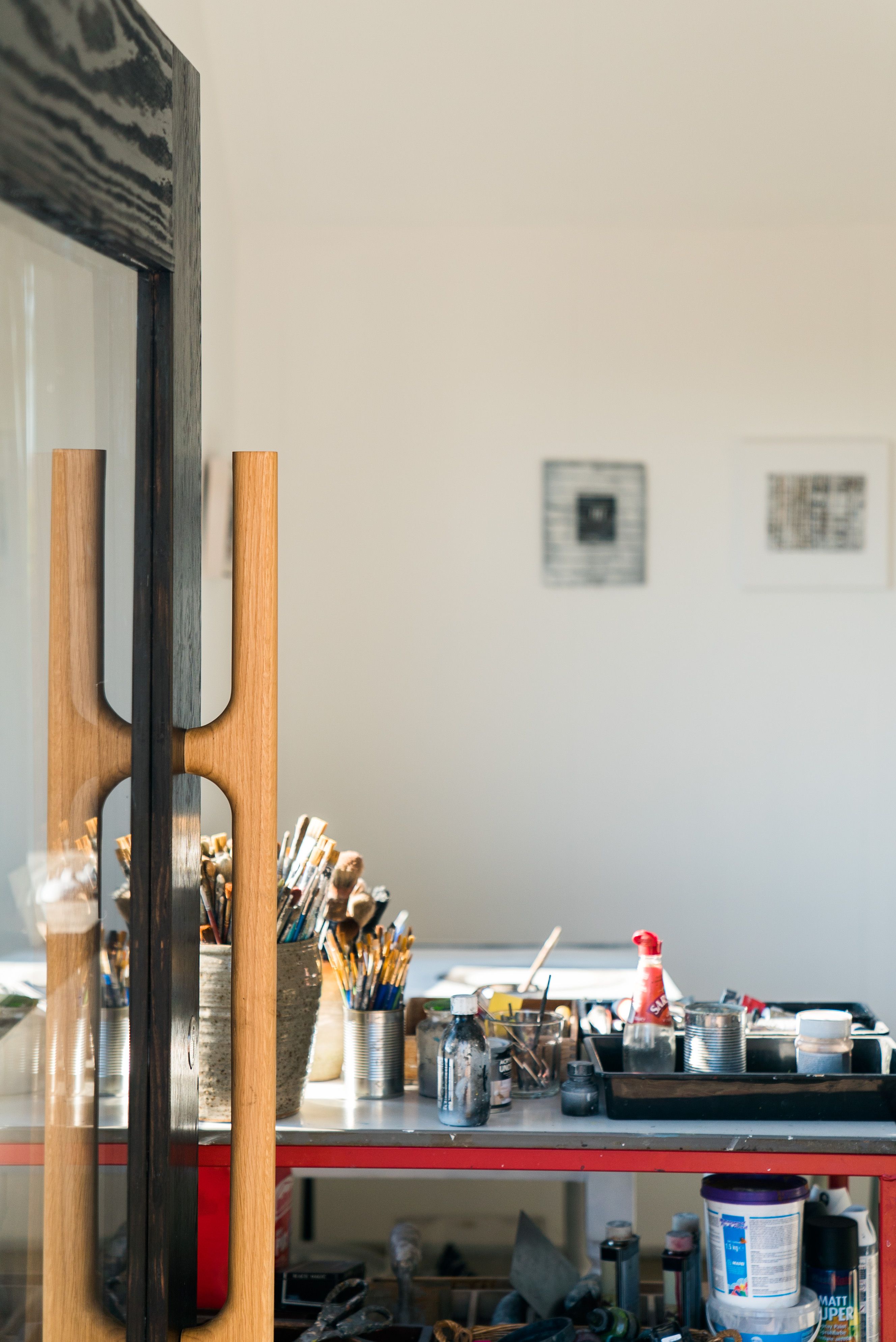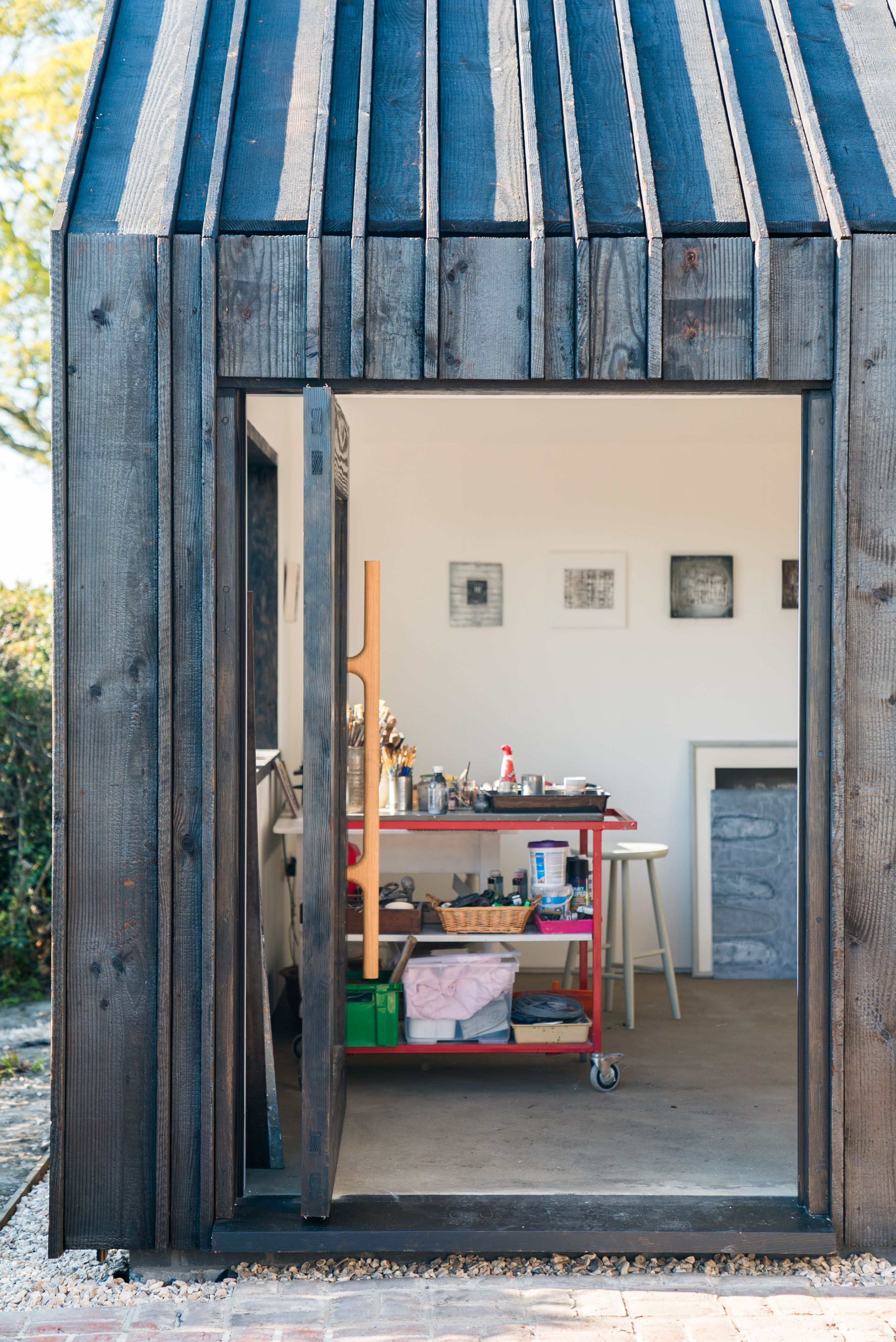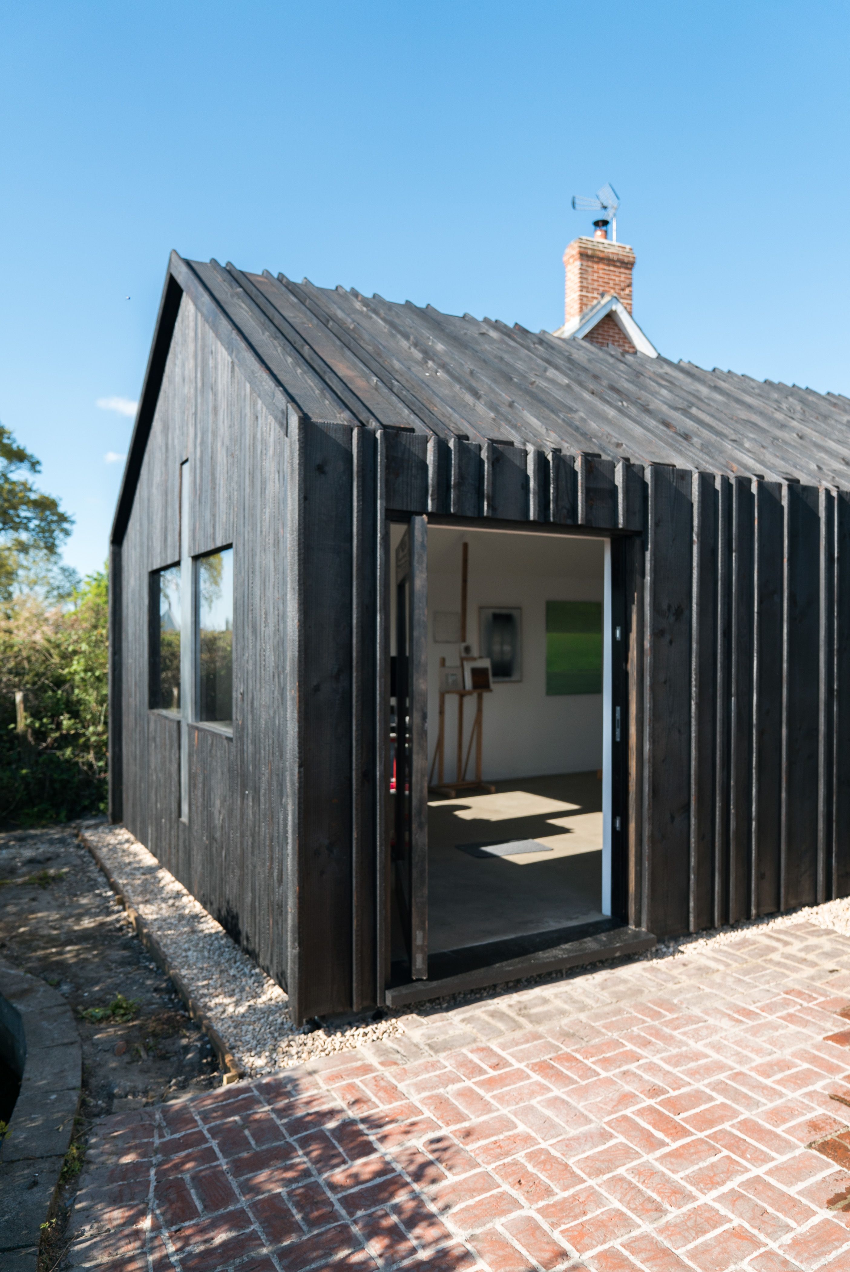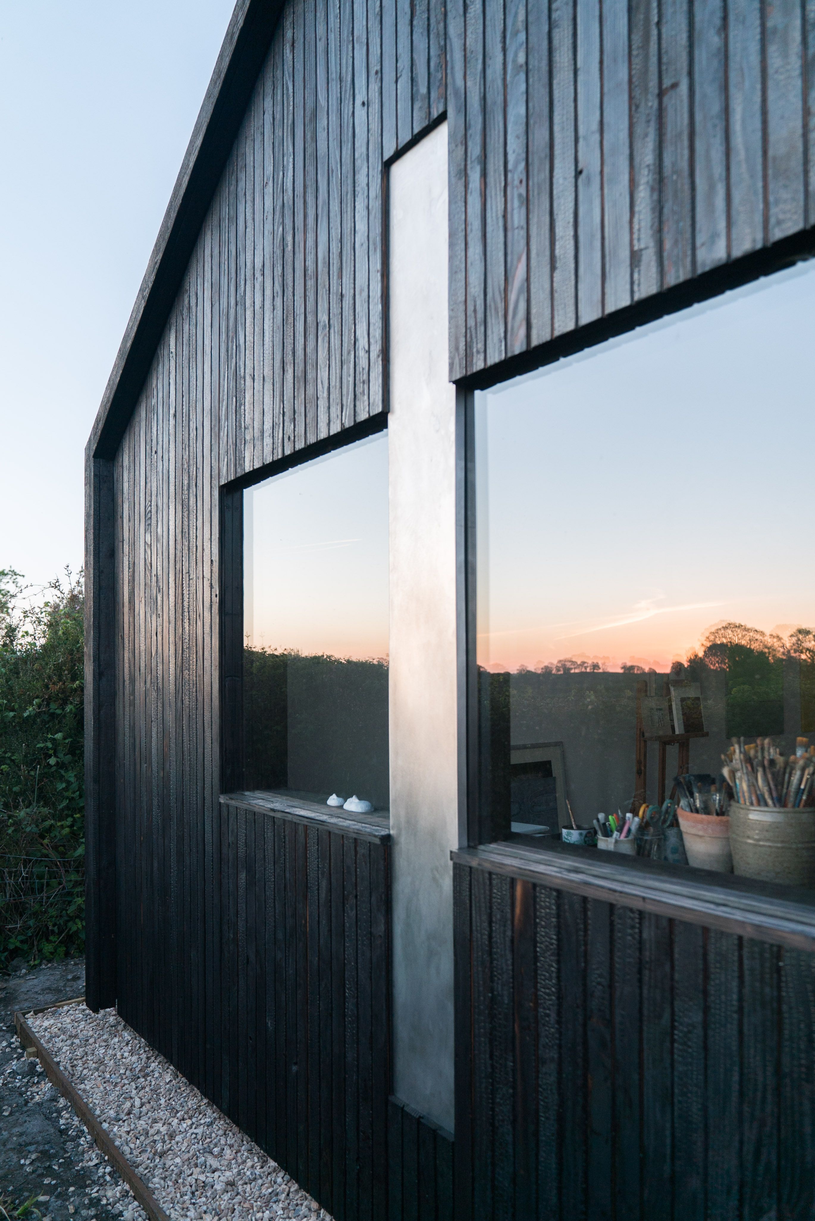 Shou Sugi Ban Japanese charred timber techniques create a silvery black cladding, its texture taking cues from the richness of Rob Woolner's large canvasses. The symmetrical openings and steel slots set in the structure create highlights within the black box, echoing the artist's work.