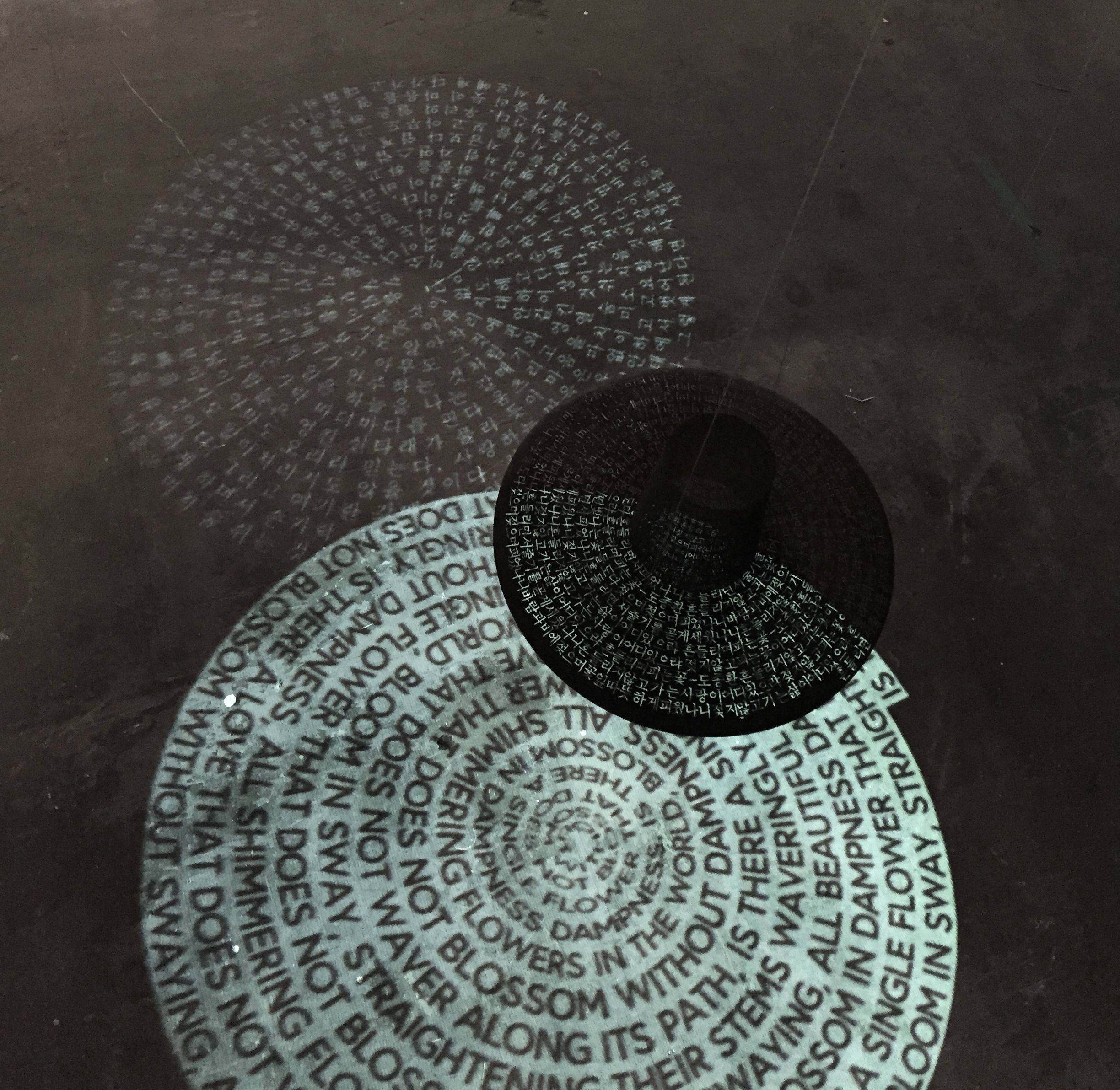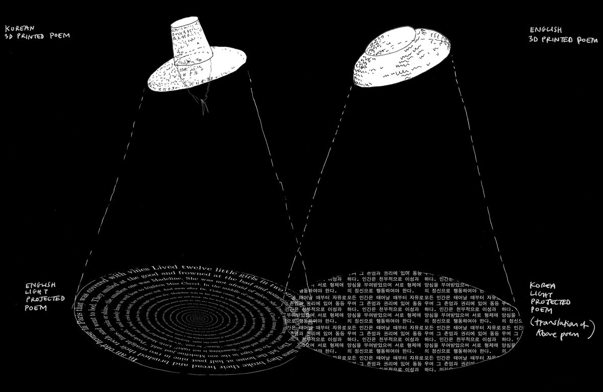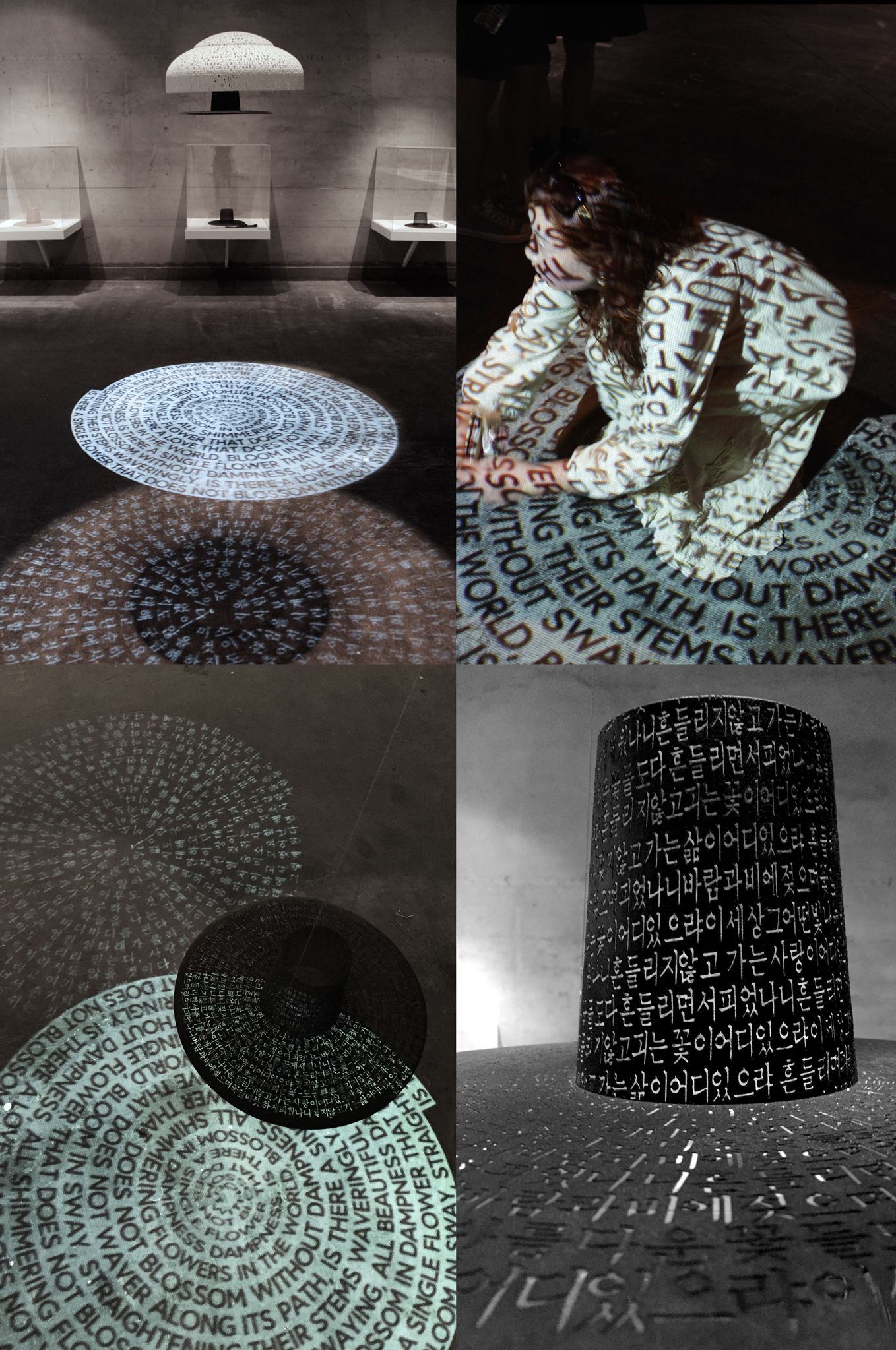 Delicately hovering in the space, the 3D printed hats are displayed so as to enable people to walk beneath them. Bathed in light, the hats cast shadows onto passing observers and the floor below, showering them with verse and transporting them to a separate poetic reality. This shadow projection is a translation of the text into the other language - the Korean hat with Korean text casts an English translation and visa-versa. Where the shadows of the hats overlap, the words become entwined, joining the ancient languages and cultures via modern technology. Ethereal and atmospheric, the installation evokes different reactions from each observer. As with poetry, interpretation is subjective, dependent upon mood and personality, with the reader/observer being the final piece of the jigsaw giving the prose/installation life and meaning. It is evident that transferring meaning to an object using words can not only change the perception of it in a significant way but also evoke a deeper response to the piece.