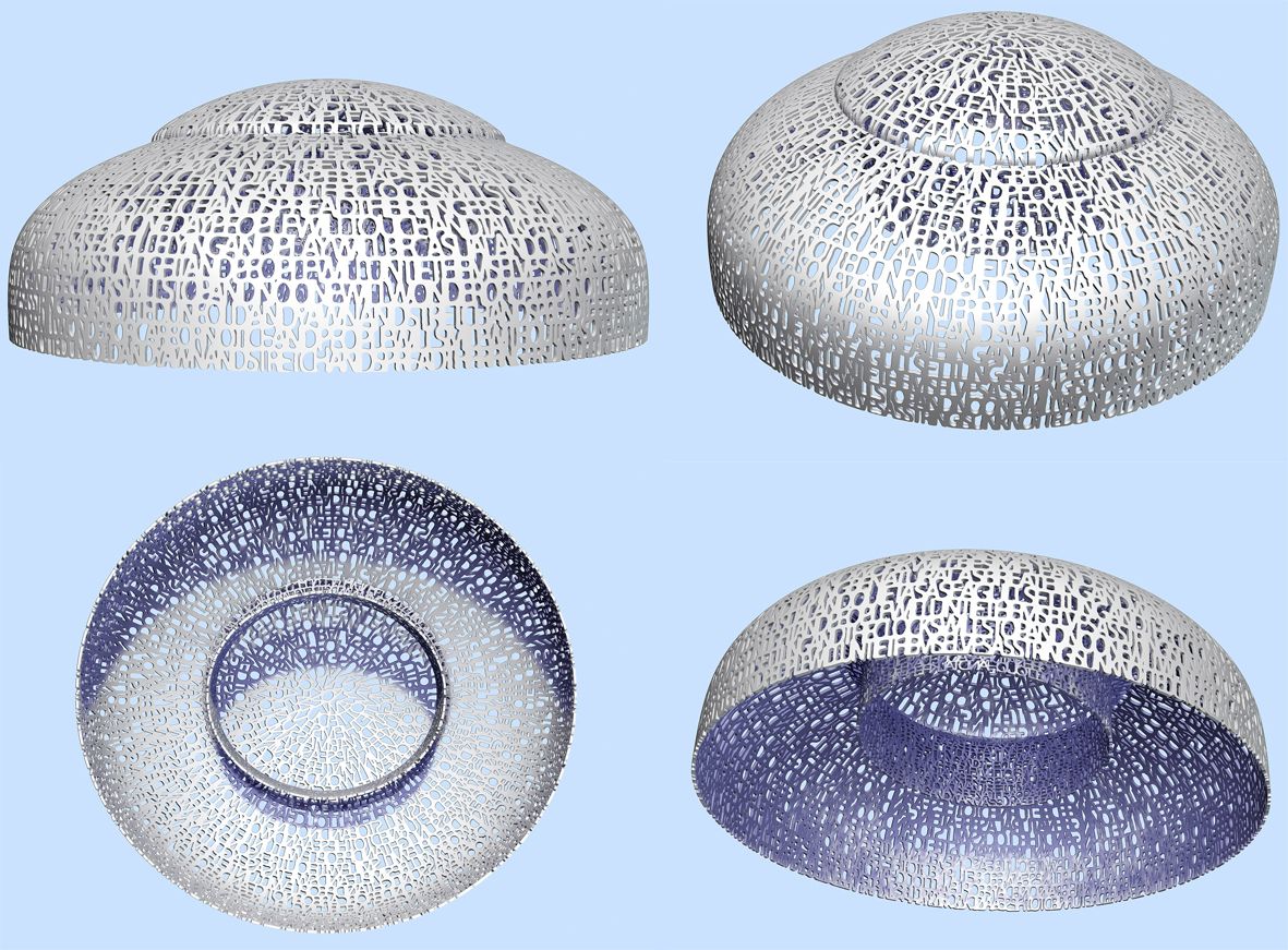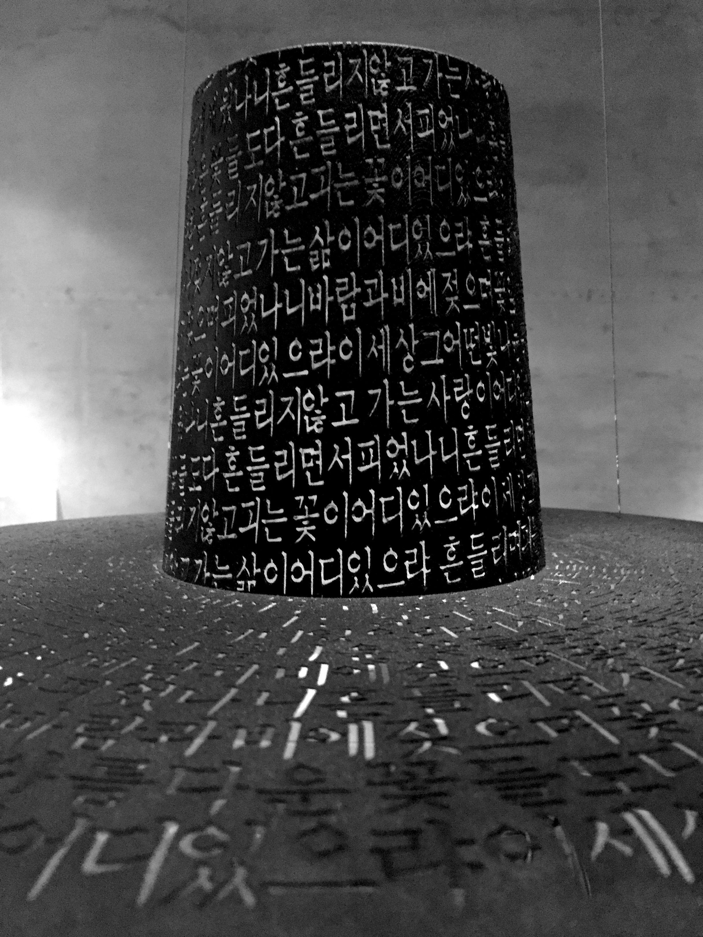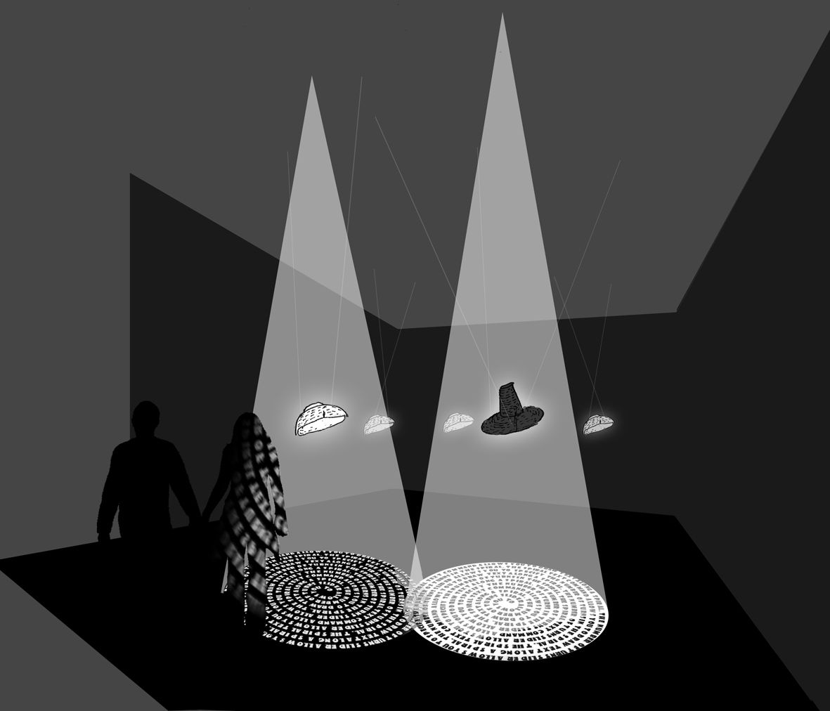 Delicately hovering in the space, the 3D printed hats are displayed so as to enable people to walk beneath them. Bathed in light, the hats cast shadows onto passing observers and the floor below, showering them with verse and transporting them to a separate poetic reality. This shadow projection is a translation of the text into the other language - the Korean hat with Korean text casts an English translation and visa-versa. Where the shadows of the hats overlap, the words become entwined, joining the ancient languages and cultures via modern technology. Ethereal and atmospheric, the installation evokes different reactions from each observer. As with poetry, interpretation is subjective, dependent upon mood and personality, with the reader/observer being the final piece of the jigsaw giving the prose/installation life and meaning. It is evident that transferring meaning to an object using words can not only change the perception of it in a significant way but also evoke a deeper response to the piece.