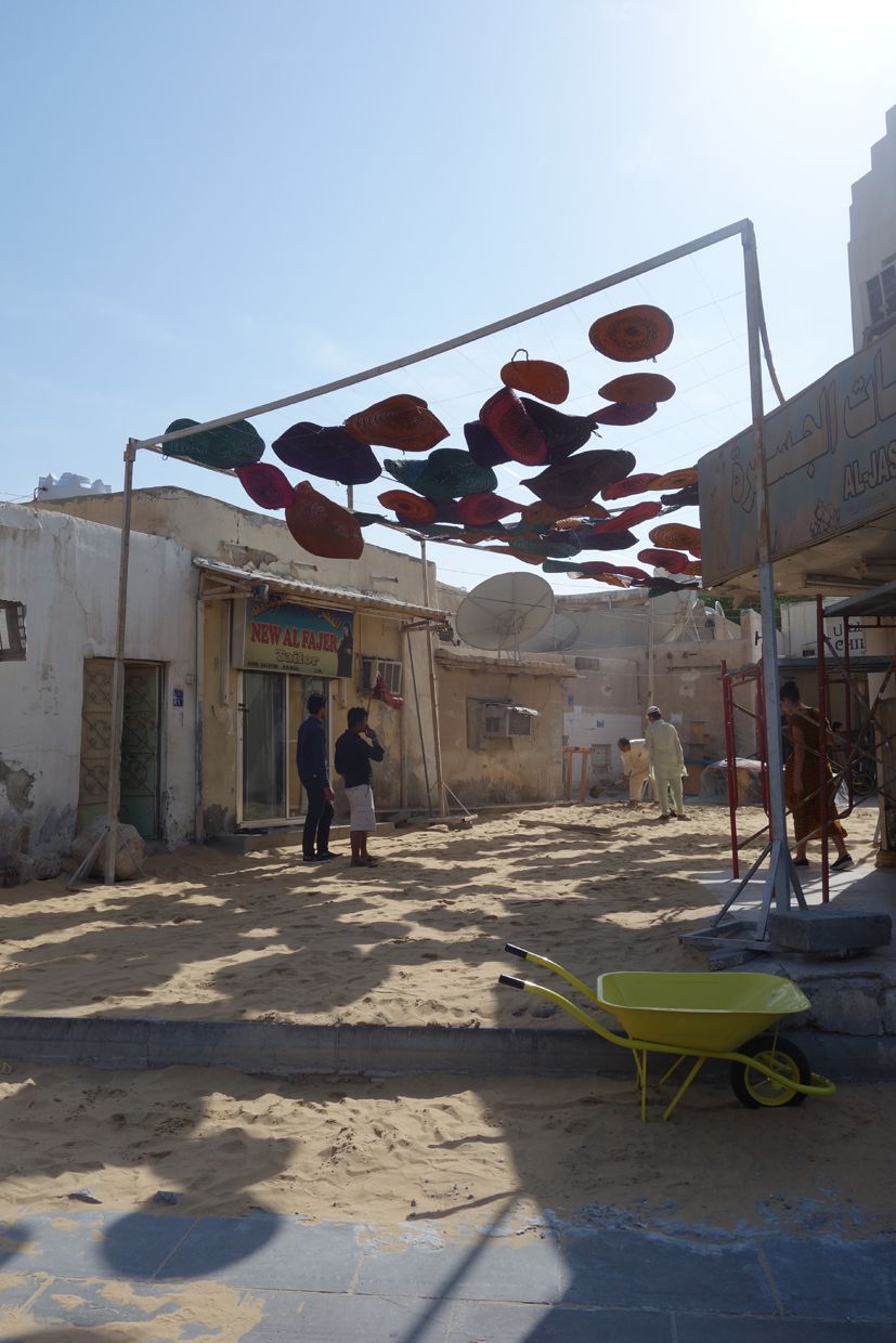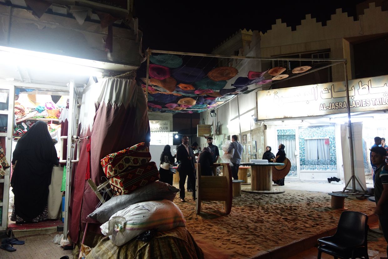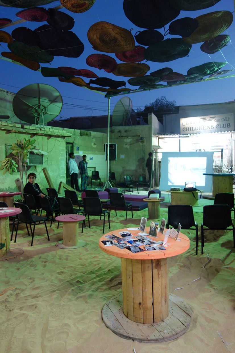 The courtyard space, an enlarged sikkah, became a social point of gathering for one day, using a temporary canopy of 100 traditional straw weave eating mats. The mats were hung from a metal frame structure and on the ground plane 10 colourful recycled cable reel tables became plinths for the exhibits, creating a domestic environment on the street.