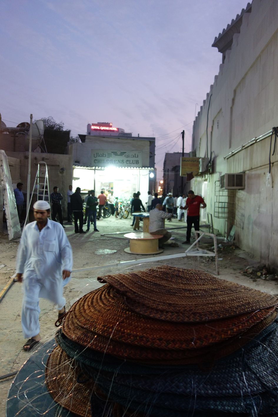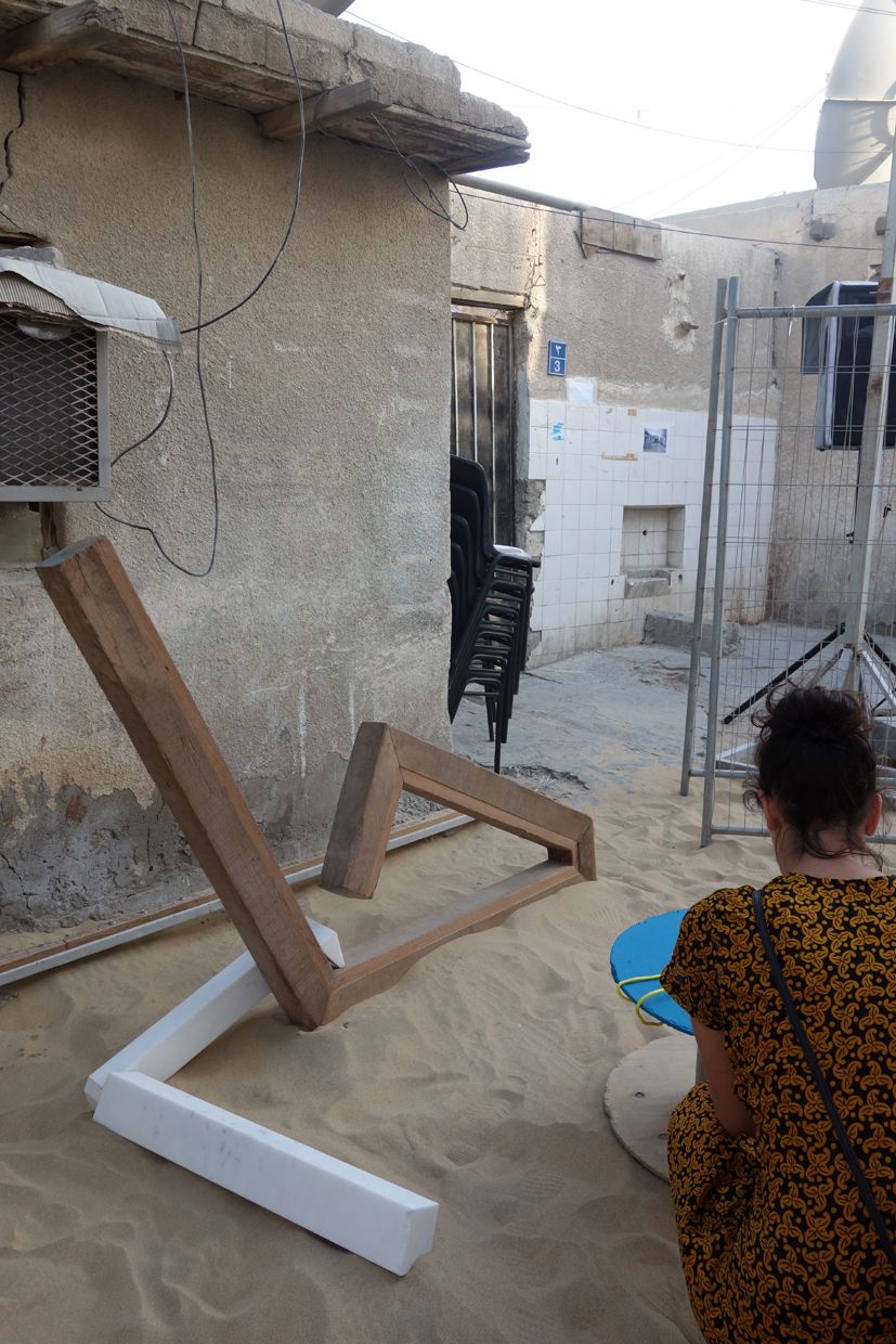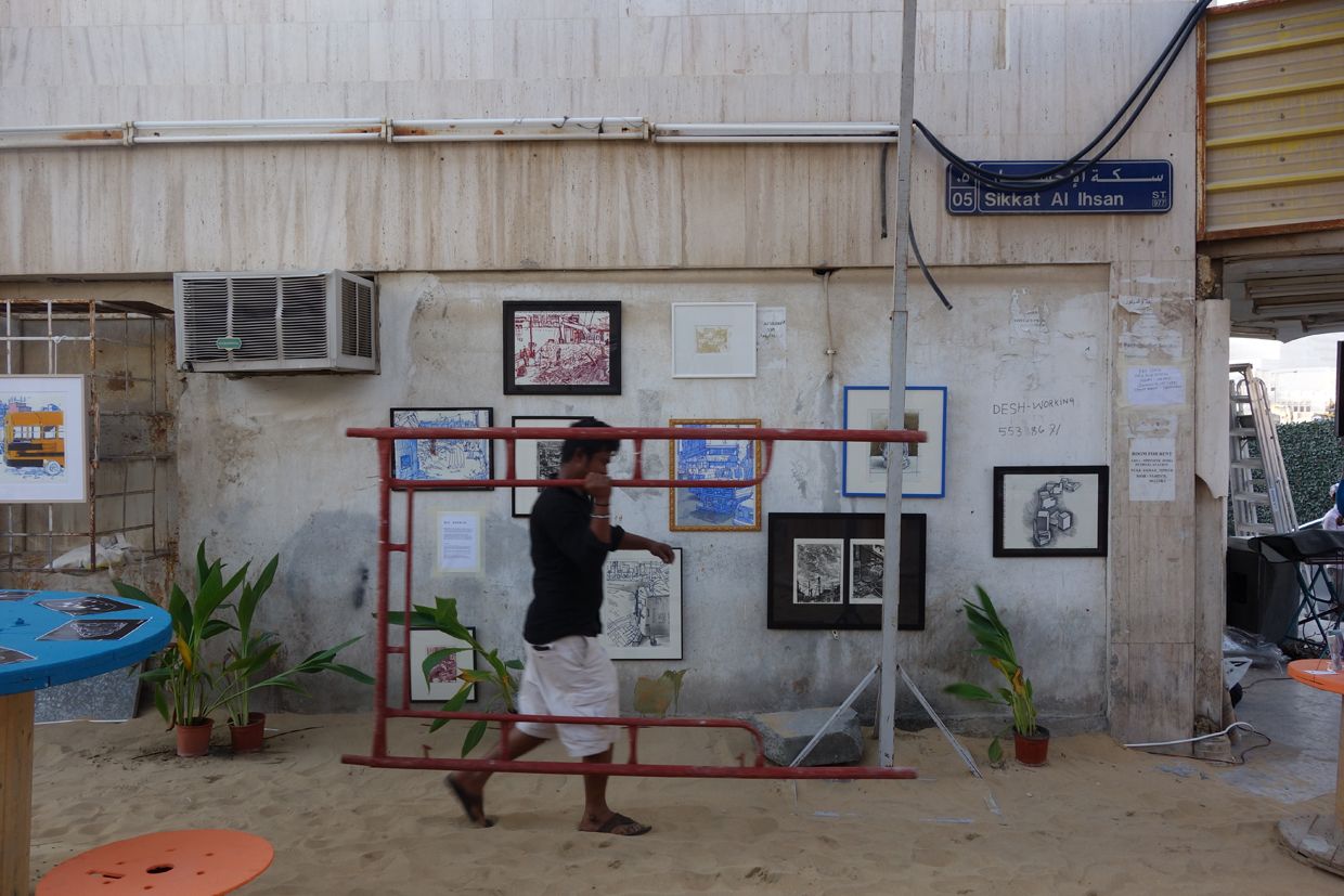 The courtyard space, an enlarged sikkah, became a social point of gathering for one day, using a temporary canopy of 100 traditional straw weave eating mats. The mats were hung from a metal frame structure and on the ground plane 10 colourful recycled cable reel tables became plinths for the exhibits, creating a domestic environment on the street.