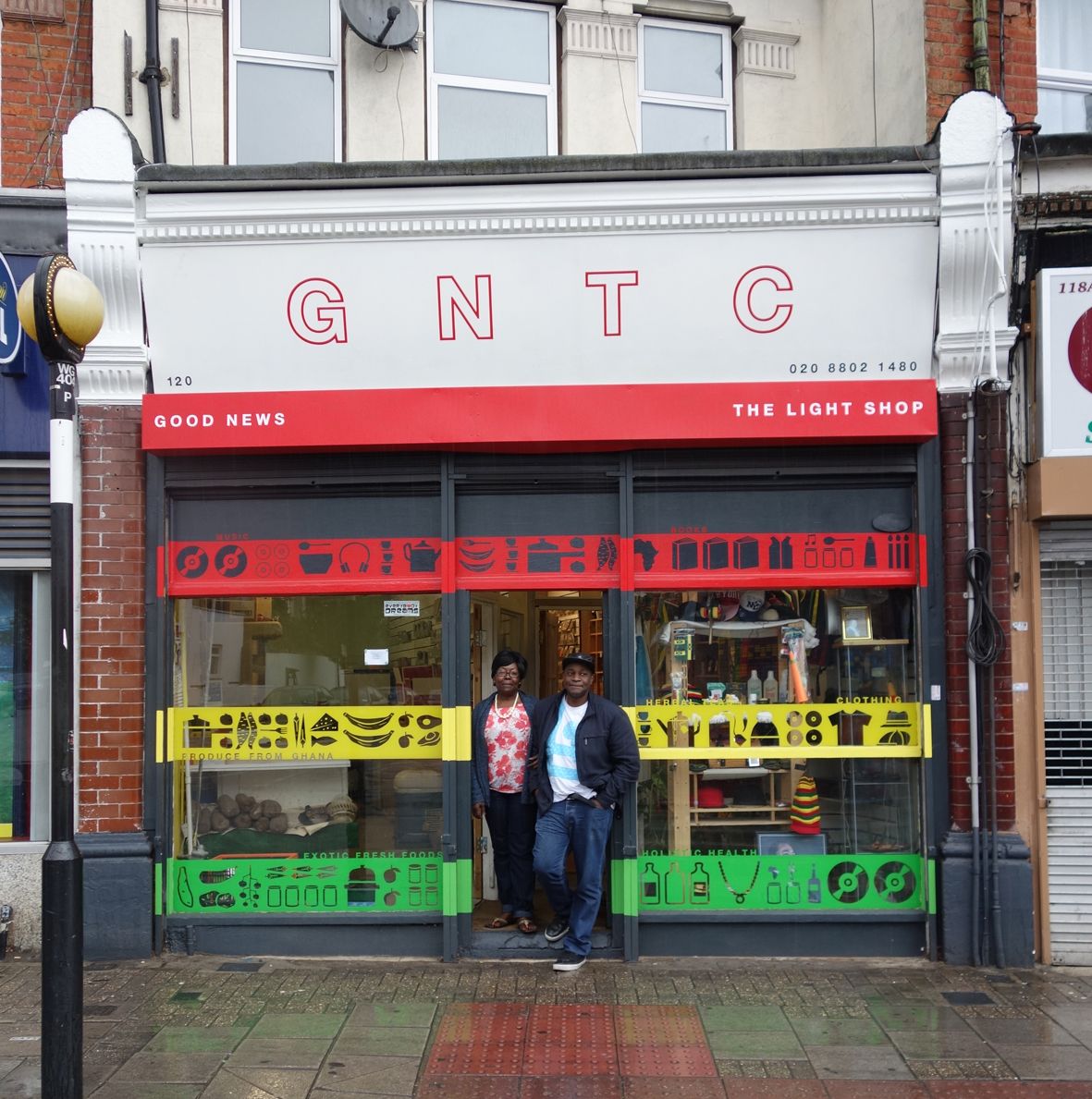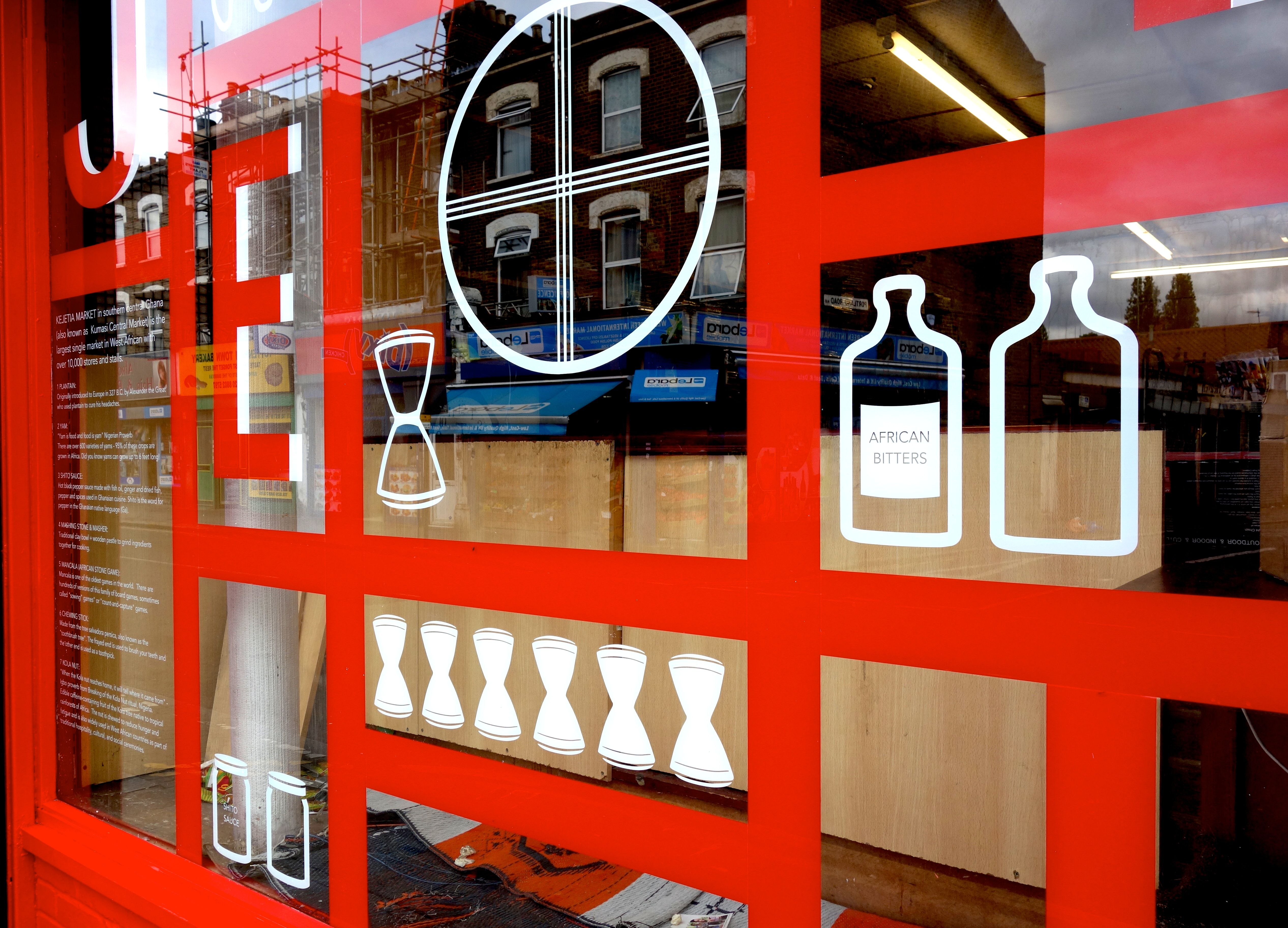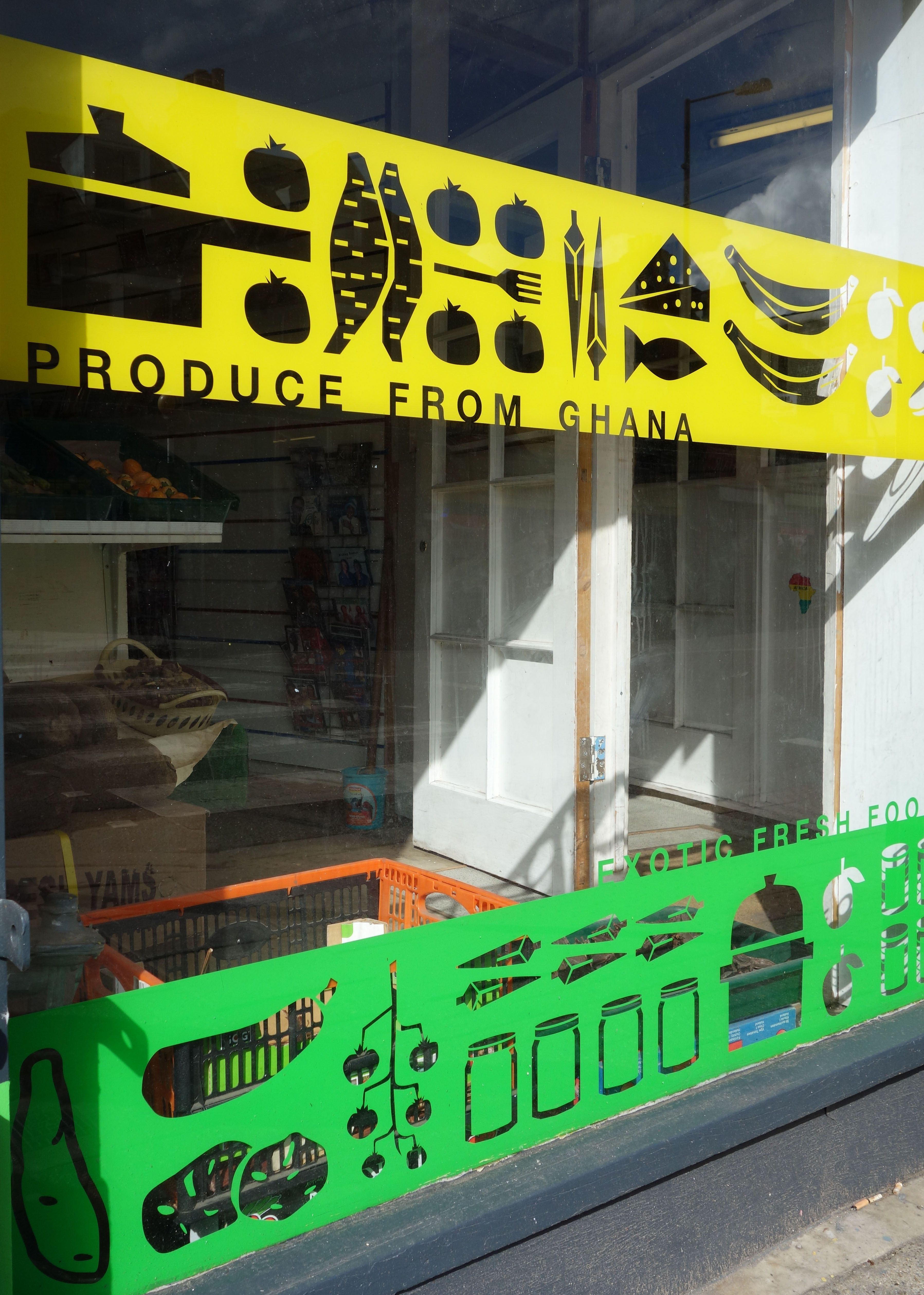 Our designs take cues from the area's rich history, community stories, as well as the services and products of the local businesses. Kejetia's shop window vinyls display her food products; Celebrations Partyware works with the shops existing red colour scheme and balloon branding; Mikuly Foods colours takes inspiration from the shop's African textiles; GNTC requested a Ghana flag colours to revamp their shop; West Green Carpets uses persian rug patterns to create patterns on the shops side shutters which are permanently down; Dobber Pharmacy declutters their existing Western Union branding for a green and white pharmacy colour scheme with supergraphic PHARMACY vinyls.