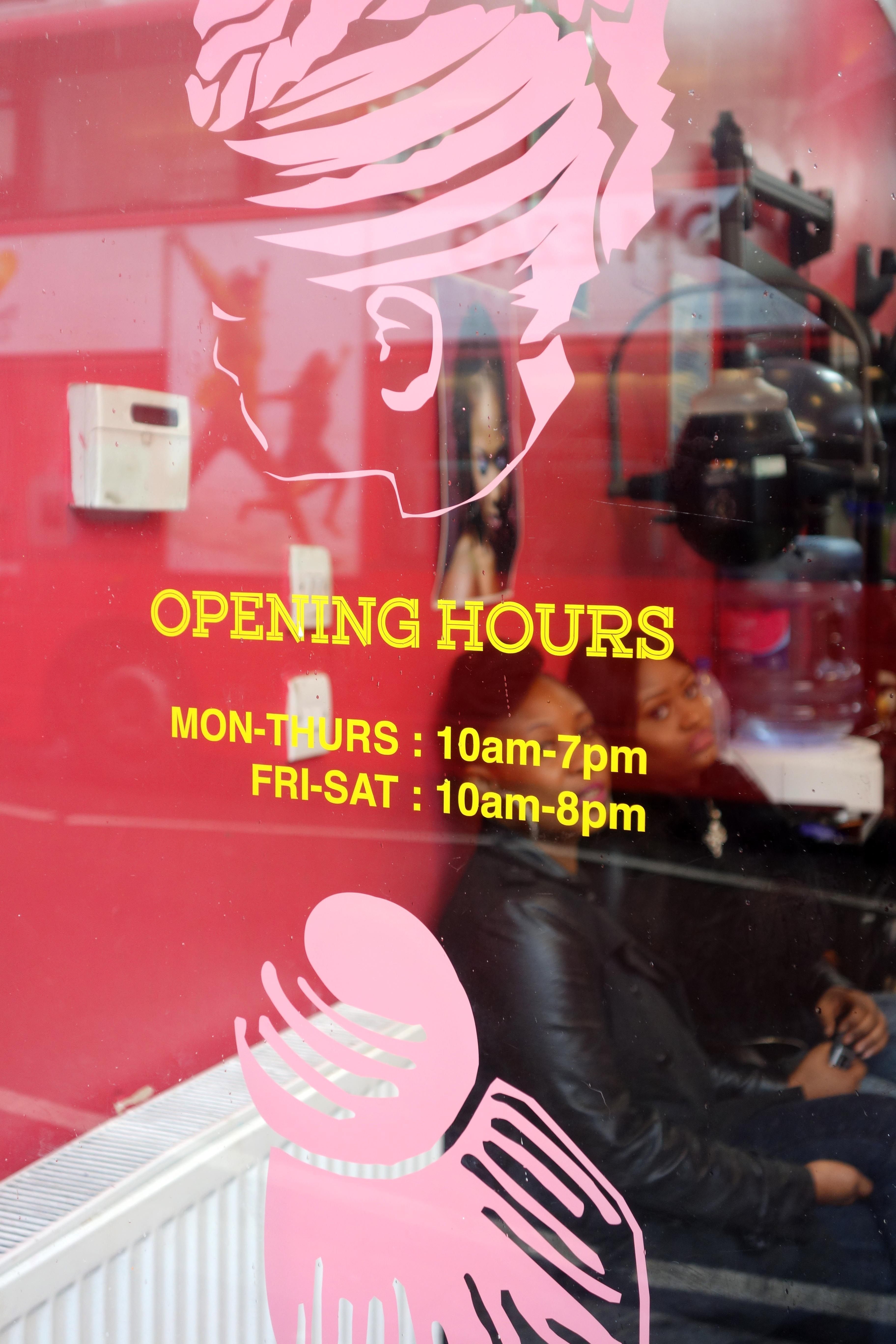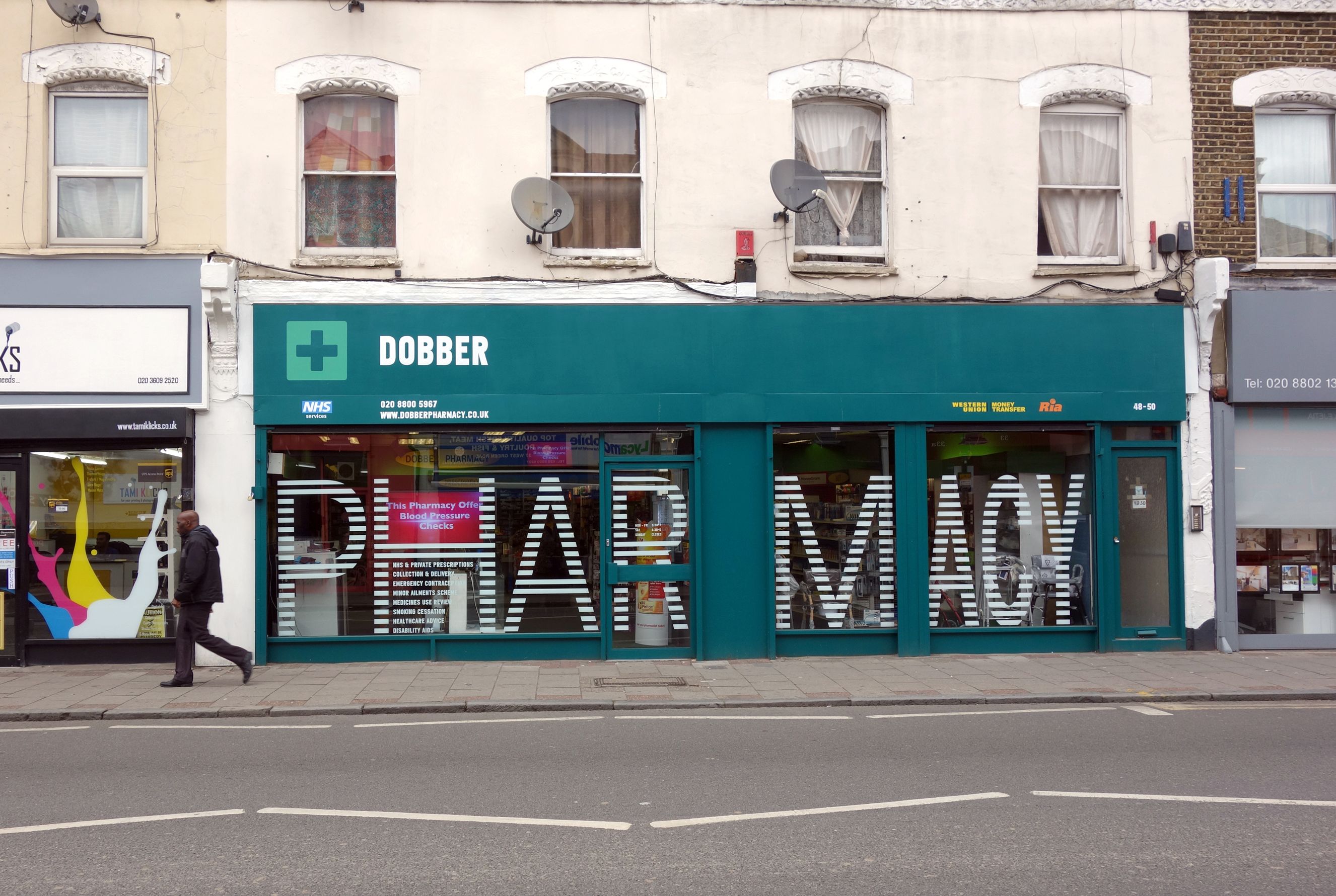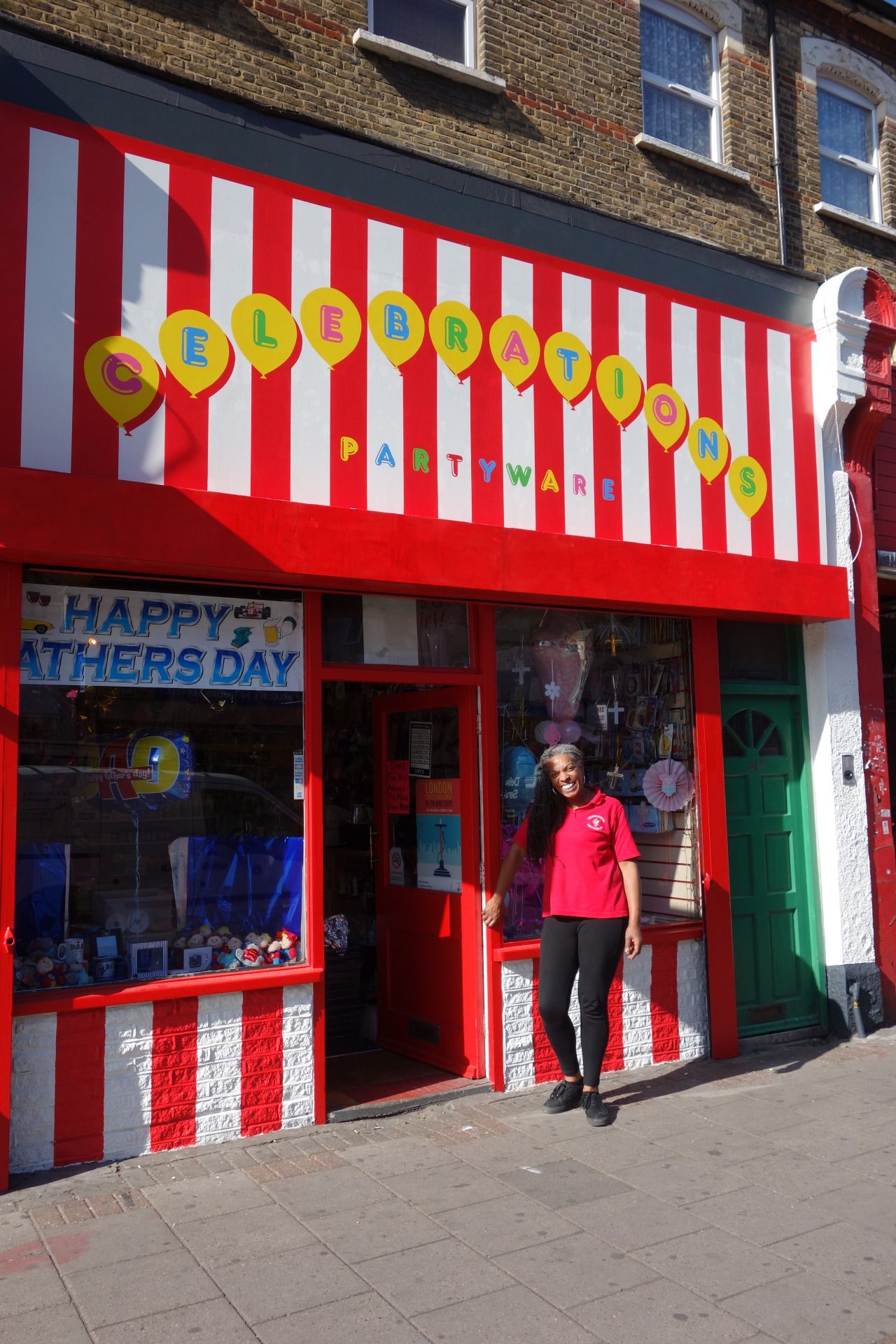 Our designs take cues from the area's rich history, community stories, as well as the services and products of the local businesses. Kejetia's shop window vinyls display her food products; Celebrations Partyware works with the shops existing red colour scheme and balloon branding; Mikuly Foods colours takes inspiration from the shop's African textiles; GNTC requested a Ghana flag colours to revamp their shop; West Green Carpets uses persian rug patterns to create patterns on the shops side shutters which are permanently down; Dobber Pharmacy declutters their existing Western Union branding for a green and white pharmacy colour scheme with supergraphic PHARMACY vinyls.