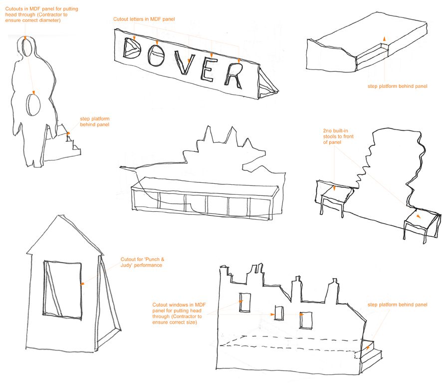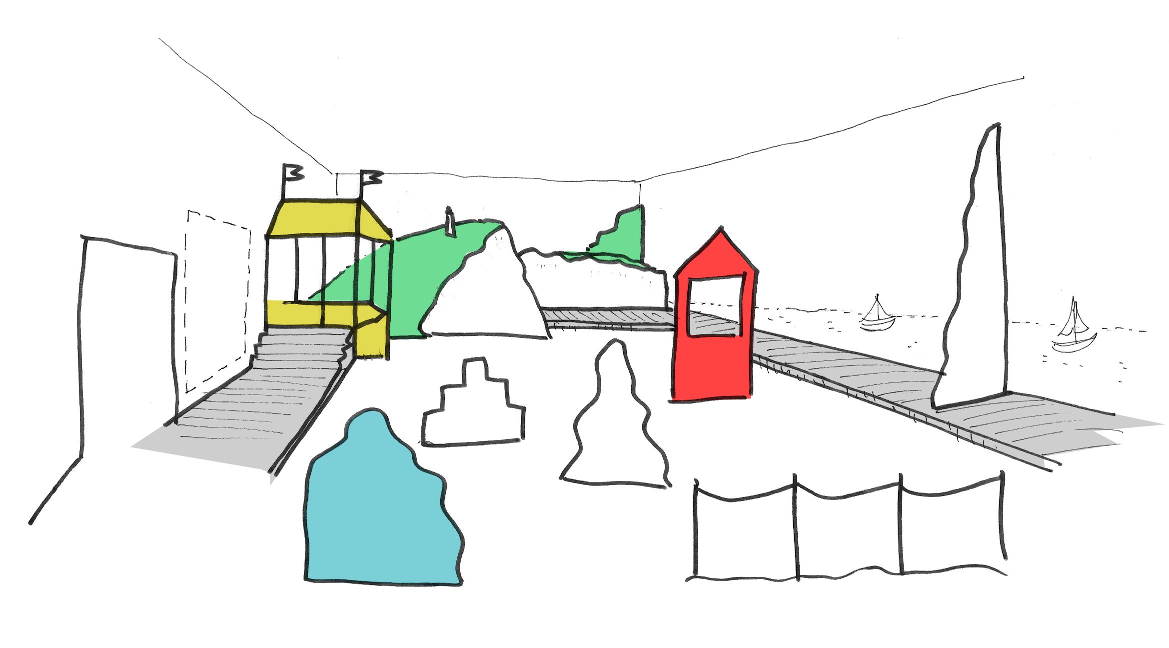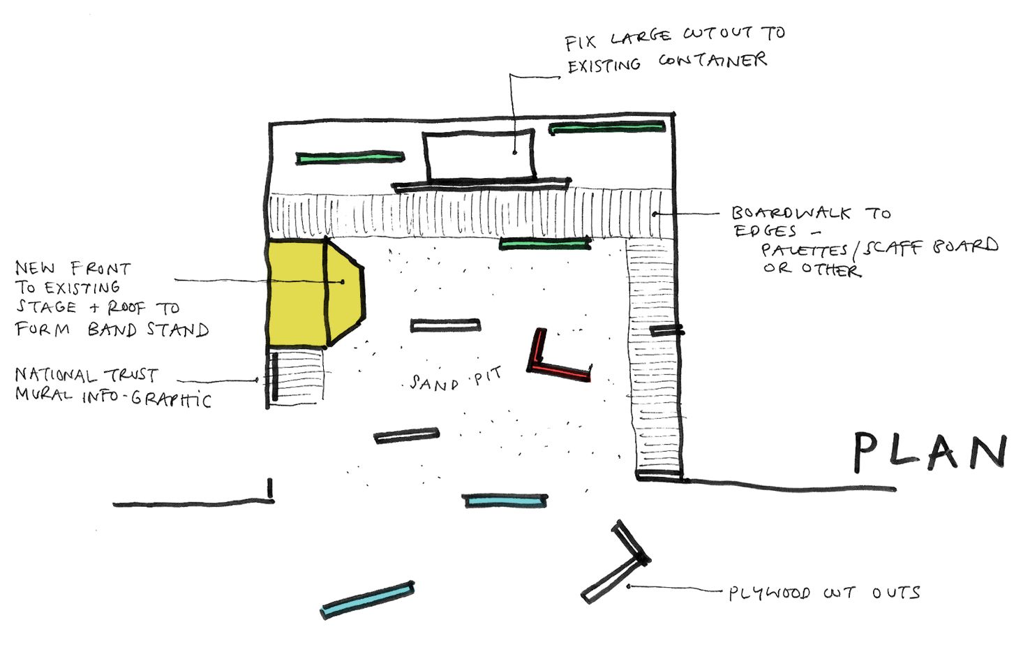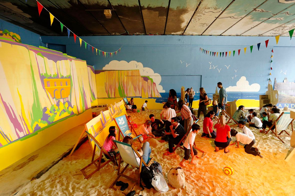 YOU&ME designed an Urban Beach at Acklam Road, Portobello for InTRANSIT Festival 2015. The public realm installation celebrates 50 years of the National Trust’s Neptune Coastline Campaign, protecting some 750 miles of Britain’s coastline. Hosting a series of engaging community participatory events and film screenings, the design comprises of a series of interactive ‘stage set’ components which create a British seaside diorama, featuring dunes, large scale scenic recreations, sandcastles, beach huts, lighthouse, deck chairs, bunting and donkey rides. The project has been developed in association with InTRANSIT, National Trust, English Heritage, Arts Council England and LB Kensington & Chelsea.