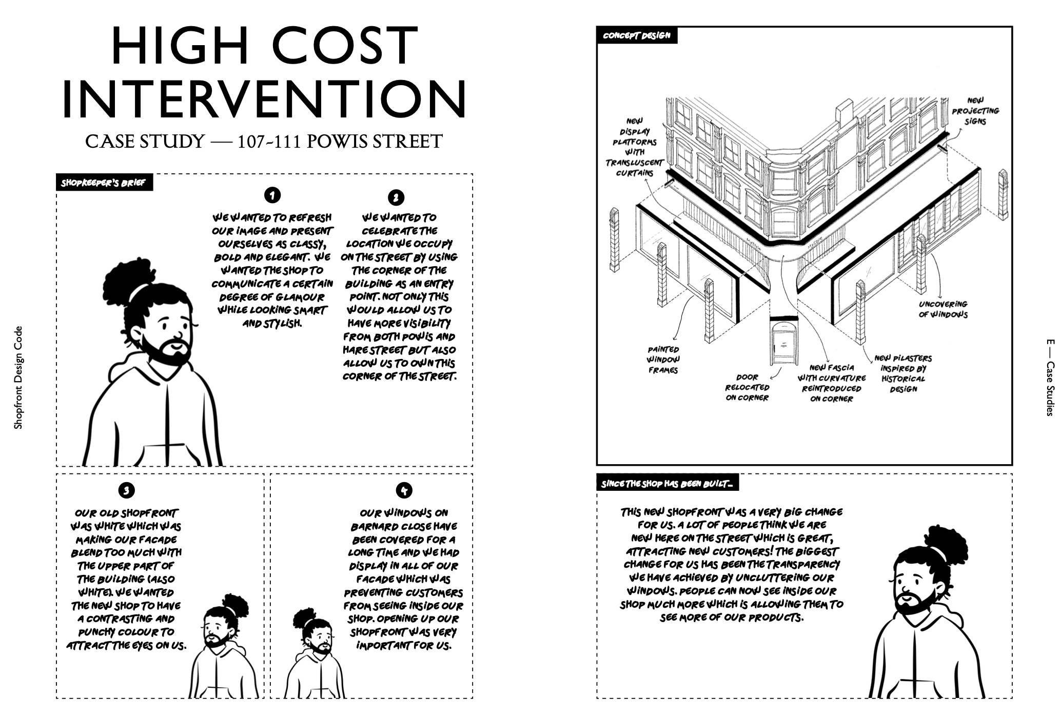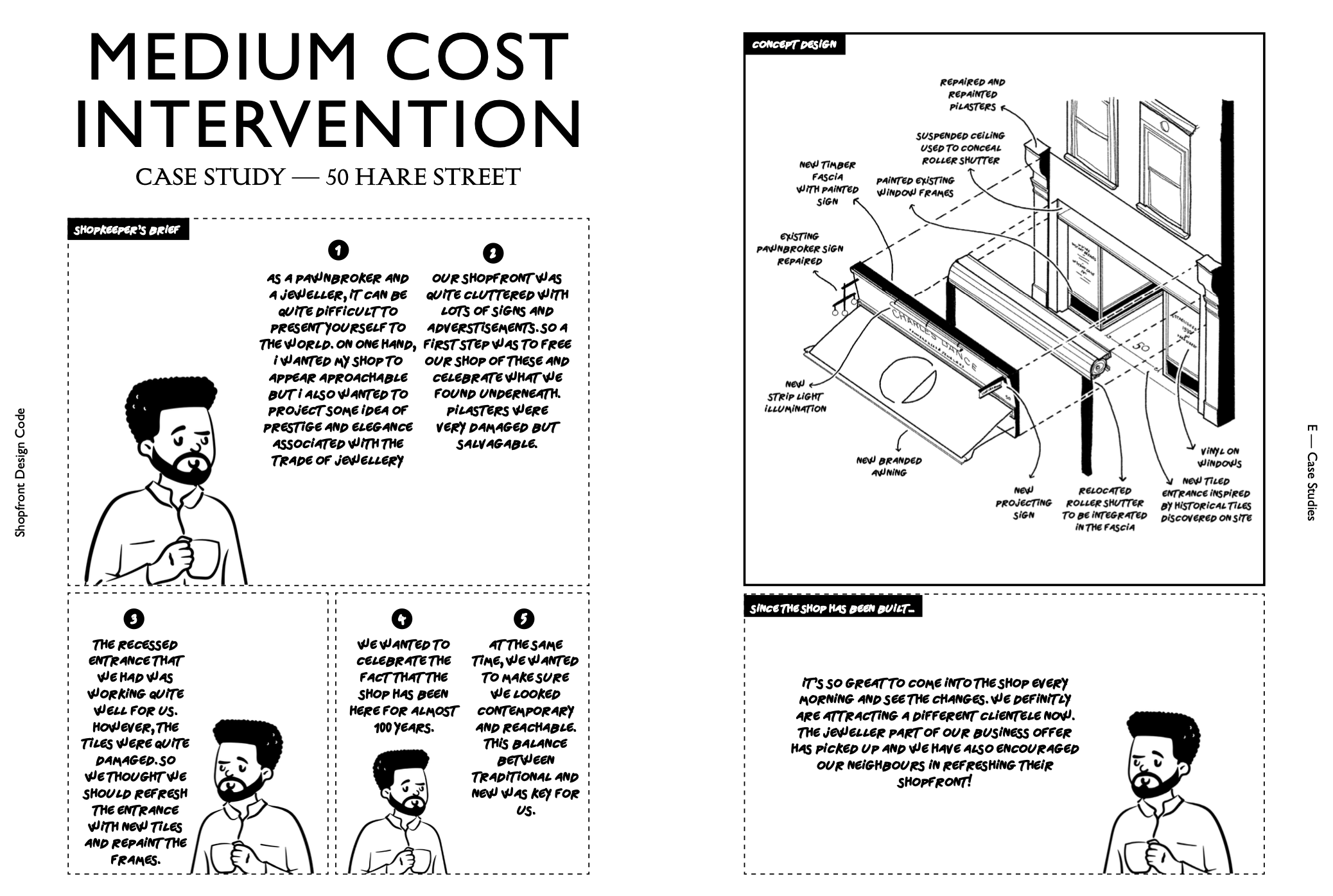 The project has a sensitive, heritage-led approach reinstating original features and proportions, working closely with local businesses on the co-design of their improved frontages.
