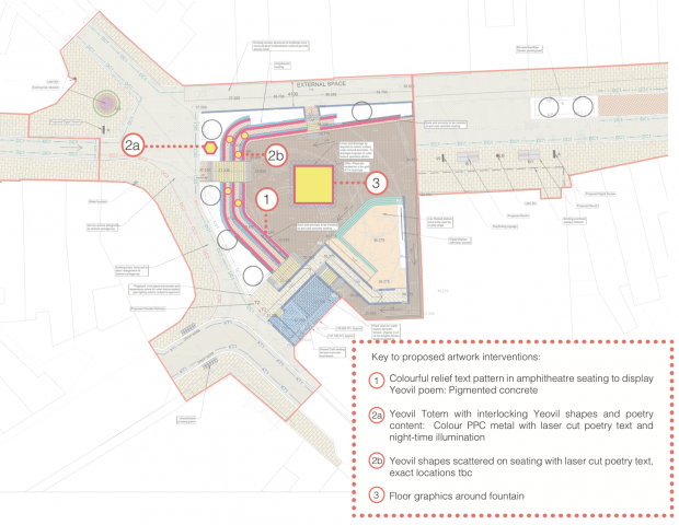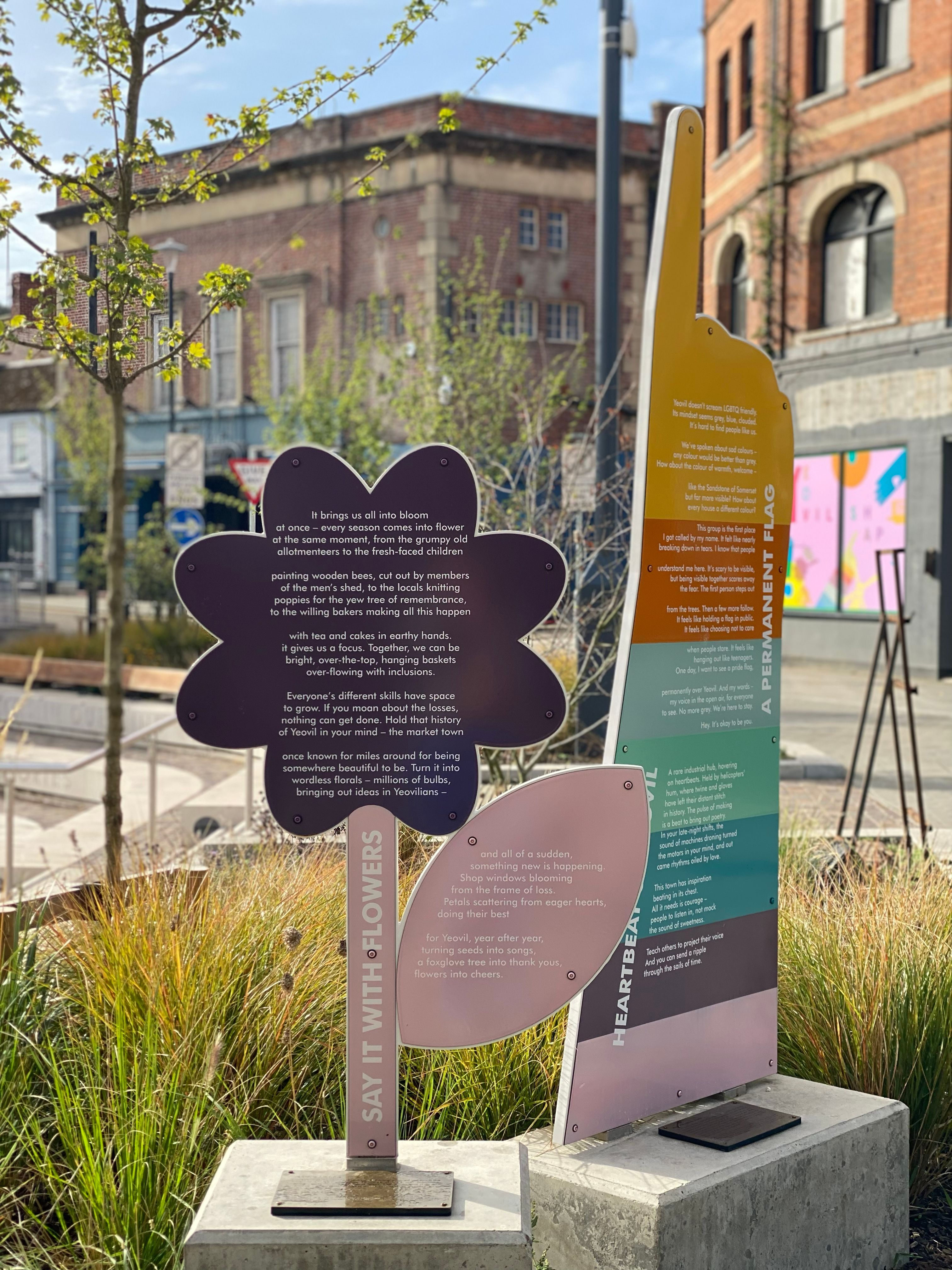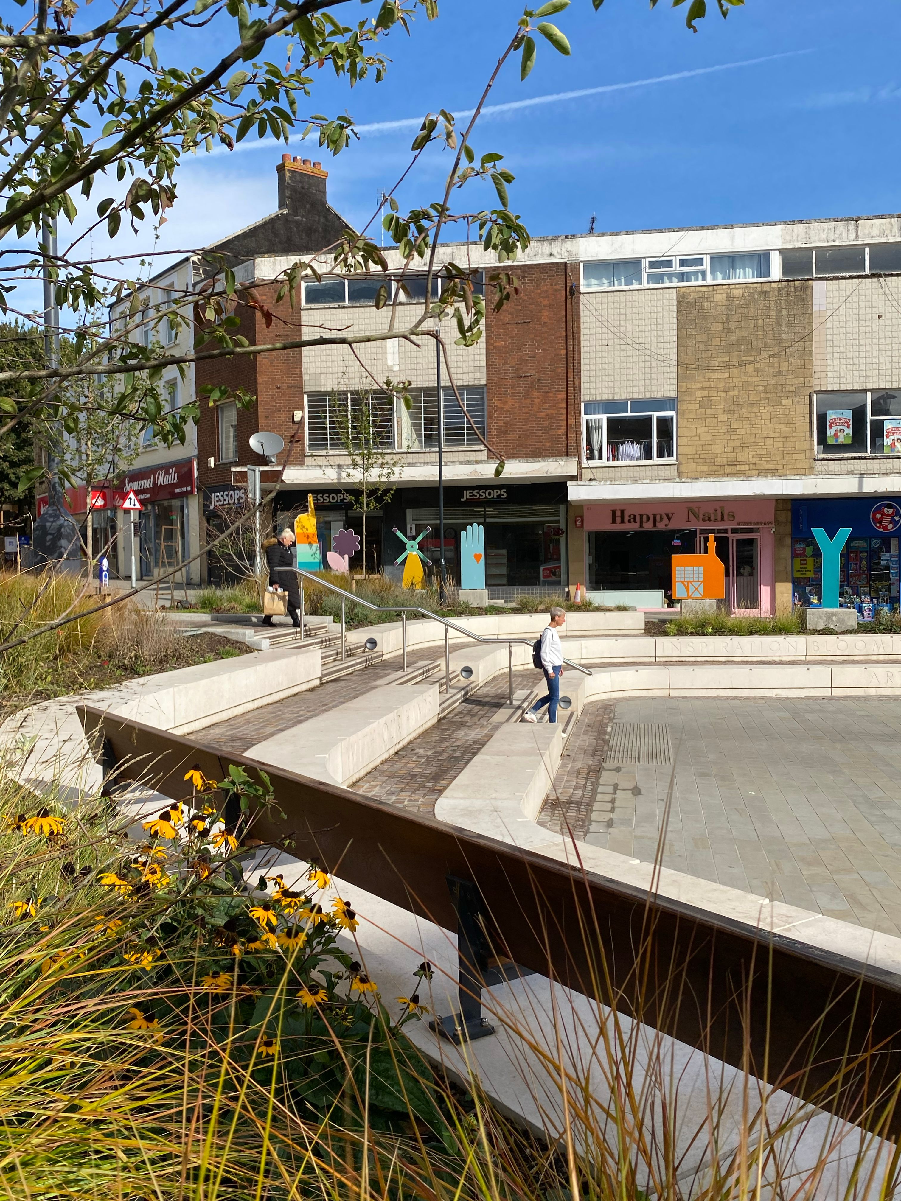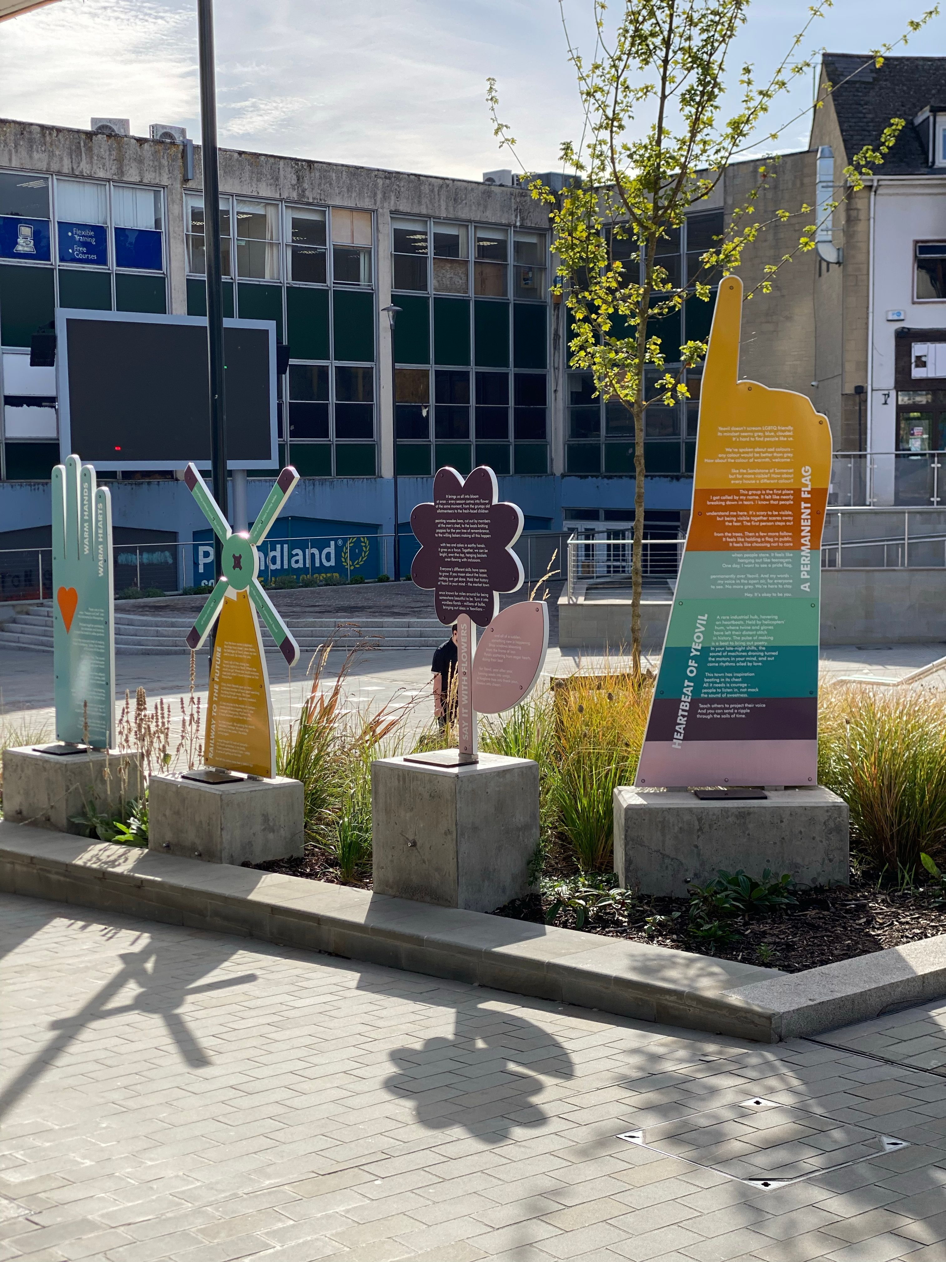The Yeovil Refresh scheme will see the public spaces in the town centre transformed and work is currently underway. The wide-reaching project includes a giant outdoor TV screen, a bus gate, a water feature, an 'amphitheatre', wider pavements, pedestrianisation of the Borough area and more. The artwork pieces will add a new colourful, impactful and welcoming layer to the new public realm and contribute towards creating a sense of place and a visual identity for Yeovil, inspired by its local community. They are focused around the new Triangle area, the civic heart of the town.